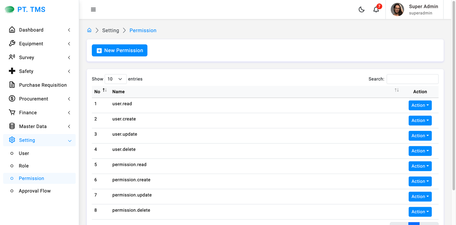 Klik Tombol "+ New Permission" di bagian atas halaman. Tombol ini memungkinkan Anda untuk membuat Permission baru di dalam sistem.
