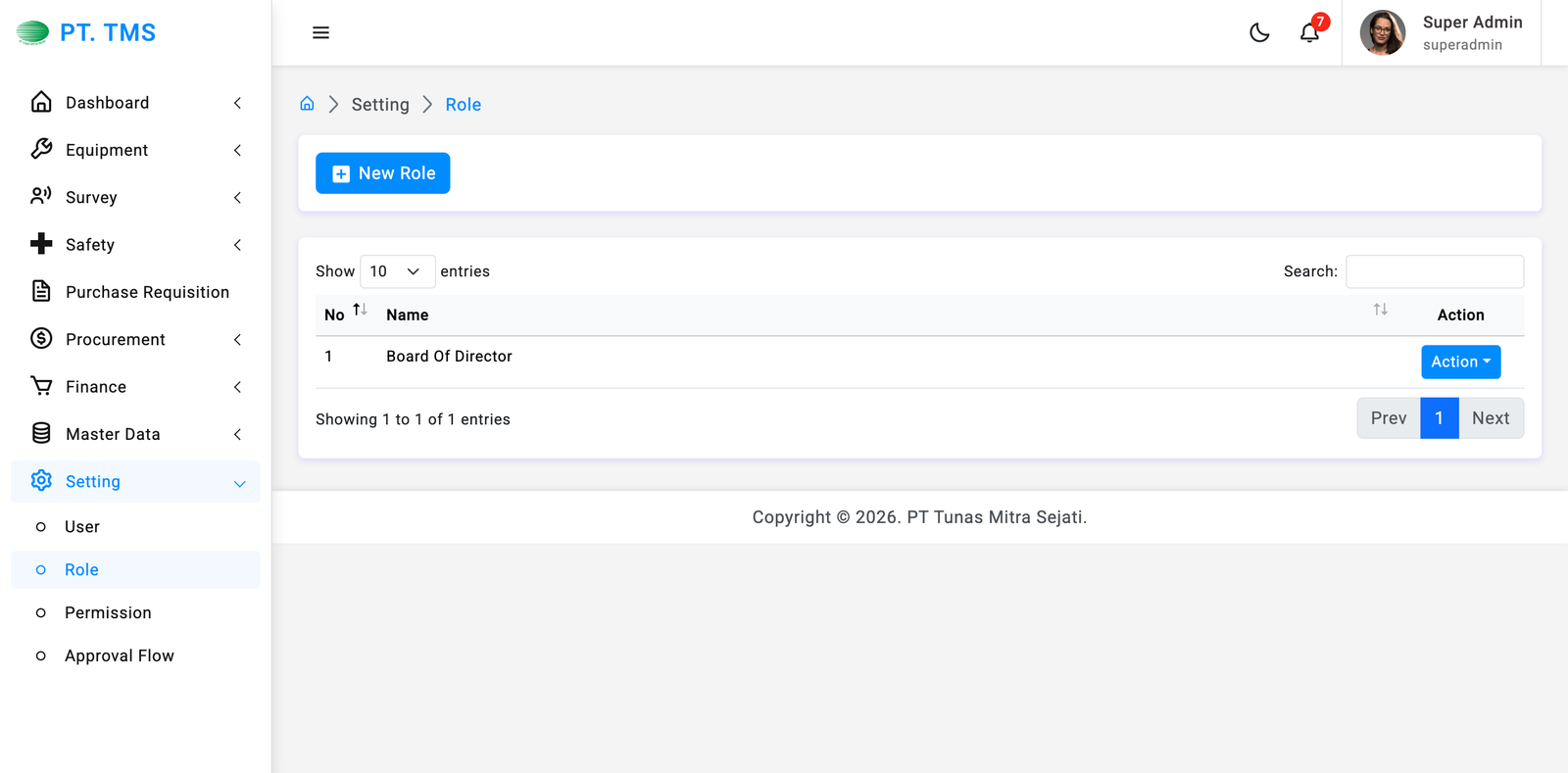 Klik Tombol "Action" di sebelah kanan Approval Flow yang ingin Anda ubah. Tombol Action berada di samping setiap Role yang terdaftar dalam tabel.