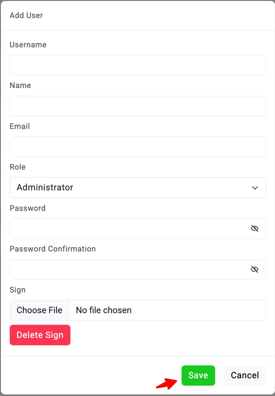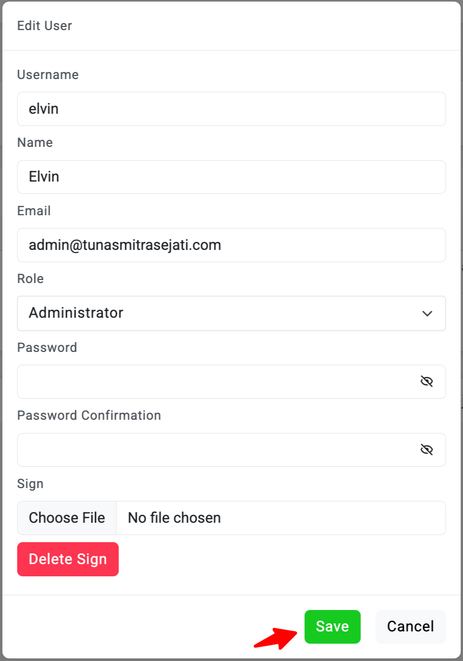 Isi Formulir dengan Detail User Baru. Anda akan diminta untuk memasukkan informasi seperti Username, Name, Email, Role, Password dan Sign User pengguna.