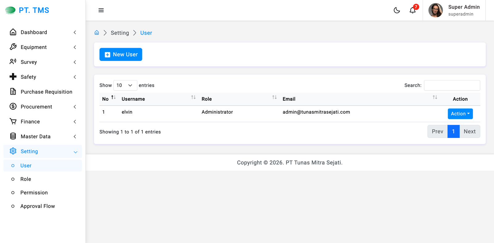 Klik Tombol "New User" di bagian atas halaman. Tombol ini akan membuka formulir untuk menambahkan User baru ke dalam sistem.